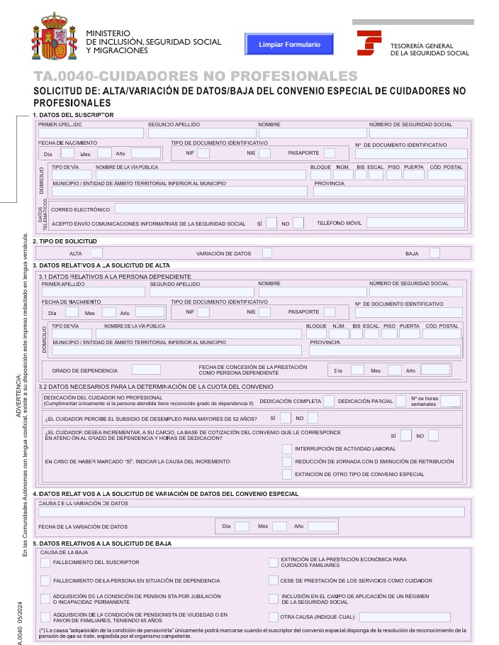 Formulario de alta/variaciones /baja del convenio especial de cuidadores no profesionales